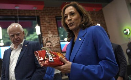 Kandidaten mit Chips: Kamala Harris und Tim Walz bei einem Wahlkampfstopp in Coralpolis, Pennsylvania. © Nikhinson/dpa
