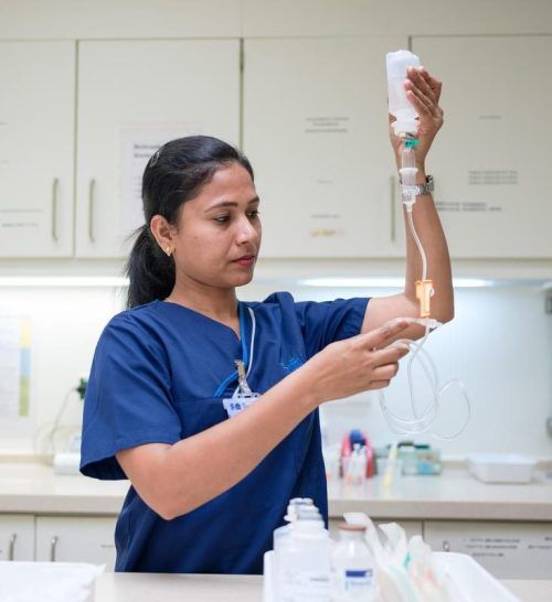 Dringend gesucht: Pflegekräfte wie die Inderin Priyaraj Prabha, die hier eine Infusion abfüllt. © Oliver Dietze/dpa
