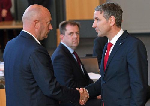 Wahlsieg mit Folgen: Thomas Kemmerich (l.) im Februar 2020 mit Thüringens rechtsextremem AfD-Fraktionsvorsitzenden Björn Höcke, einem seiner ersten Gratulanten. © dpa/Schutt
