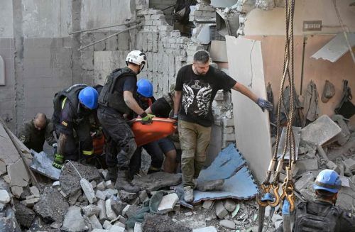 Unter Dauerfeuer: Im ukrainischen Charkiw retten Helfer nach einem russischen Raketeneinschlag einen Verwundeten. © AFP