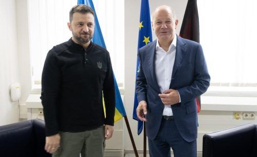 Erst in Ramstein, dann beim Kanzler: Wolodymyr Selenskyj am Freitag mit Olaf Scholz. © Boris Roessler/dpa