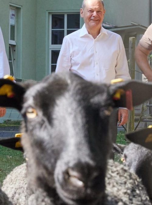 Olaf Scholz am Samstag mit einem Goländischen Pelzschaf in seinem Wahlkreis. © dpa