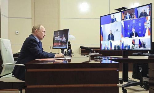 „Droht, wann er will“: Russlands Machthaber Wladimir Putin bei einer Video-Konferenz mit seinem Sicherheitsrat. © AFP