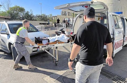 Ersthelfer des Zivilschutzes bringen einen verletzten Mann, dessen Pager explodiert ist, ins Krankenhaus. © dpa/Malla
