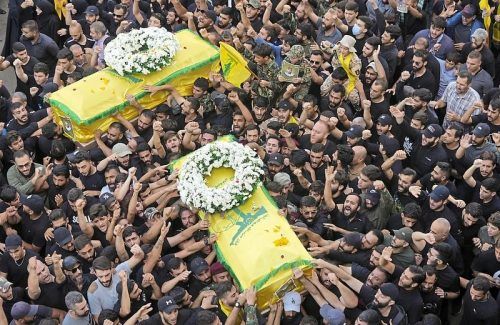 Wut der Islamisten: Hisbollah-Mitglieder tragen die Särge von zwei Kameraden, die am Mittwoch durch Explosionen ihrer Funkgeräte getötet wurden. © Hussein Malla/dpa