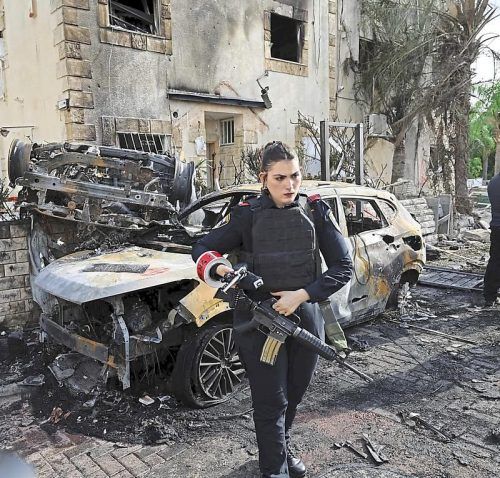 Hin und her: Eine israelische Sicherheitskraft sichert ein Gelände in der Gegend von Haifa ab, das von der Hisbollah beschossen worden sein soll. © Jack Guez/AFP