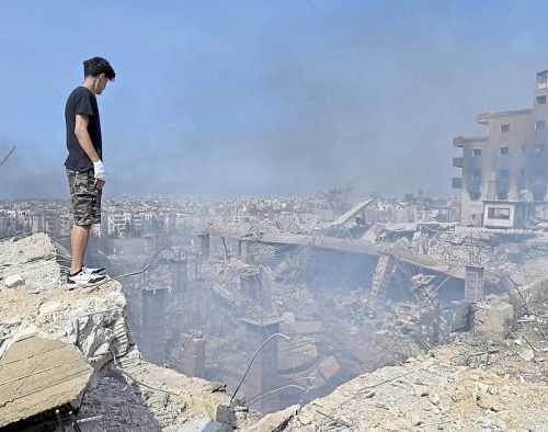 Trümmer, Rauch und ein Krater: Augenzeugen in der Hauptstadt Beirut begutachten die zerbombten Häuser. Nicht alle trauern. © WAEL HAMZEH/epa