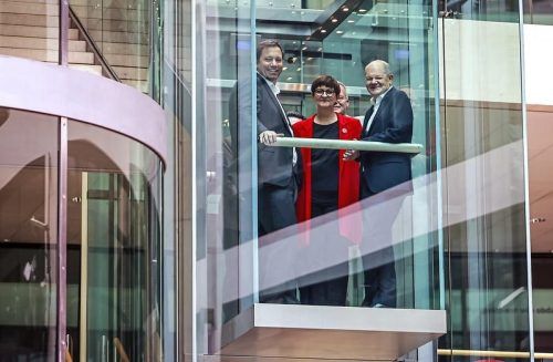 Rauf oder runter? Lars Klingbeil, Saskia Esken und Olaf Scholz im Lift auf dem Weg zur SPD-Vorstandsklausur in der Parteizentrale. © HANNIBAL HANSCHKE