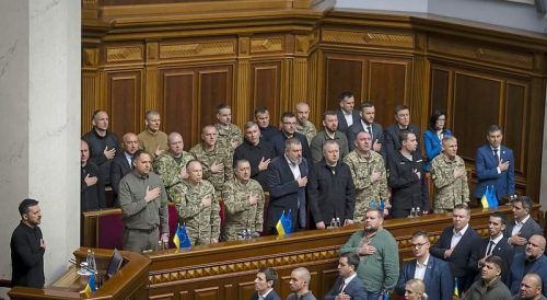 Große Einigkeit im ukrainischen Parlament: Präsident Wolodymyr Selenskyj (l.) lauscht gemeinsam mit den Abgeordneten der Nationalhymne. © Press Service Of The President/dpa