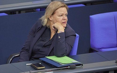 Schüttelt vehement den Kopf: Bundesinnenministerin Nancy Faeser (SPD) wehrt sich im Bundestag gegen die Kritik der Union an ihrem Sicherheitspaket. © Jörg Carstensen/dpa