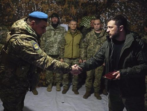 Hoffen, bald wieder Licht zu sehen: Der ukrainische Präsident Wolodymyr Selenskyj (r.) zeichnet Soldaten in der Frontstadt Pokrowsk aus, dem Schauplatz der schwersten Kämpfe mit den russischen Truppen in der