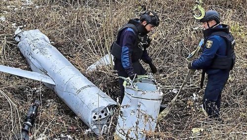 Überreste eines Angriffs: Helfer beseitigen bei Kiew einen russischen Marschflugkörper. © AFP