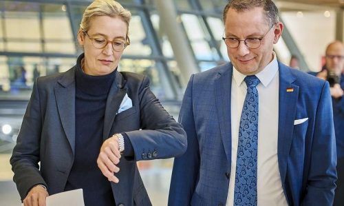 Sieht ihre Zeit gekommen: AfD-Chefin Alice Weidel, hier mit Co-Chef Tino Chrupalla, soll am Wochenende offizielle Kanzlerkandidatin werden. © Mike Schmidt/SZ-Photo