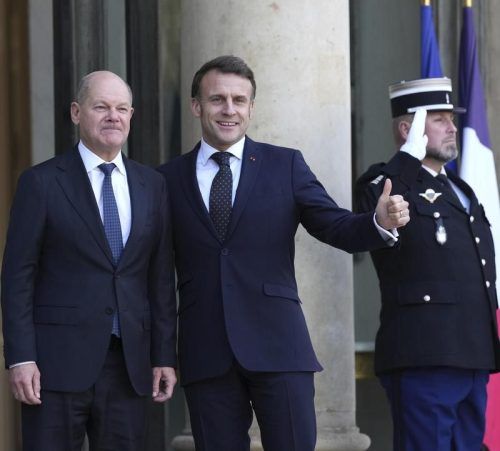 Freundlicher Empfang in ernster Lage: Der französische Präsident Emmanuel Macron (r .) begrüßt Bundeskanzler Olaf Scholz zum Krisengipfel in Paris. © Aurelien Morissard/dpa