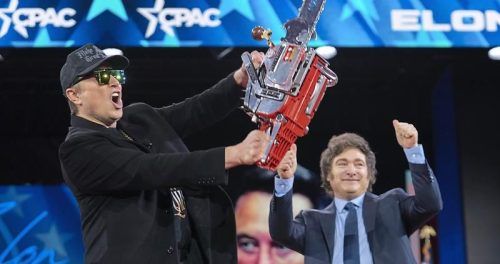 Exzentrik im Duett: Musk mit Argentiniens Präsident Milei, der die Kettensäge im Wahlkampf etabliert hatte. © Magana/dpa