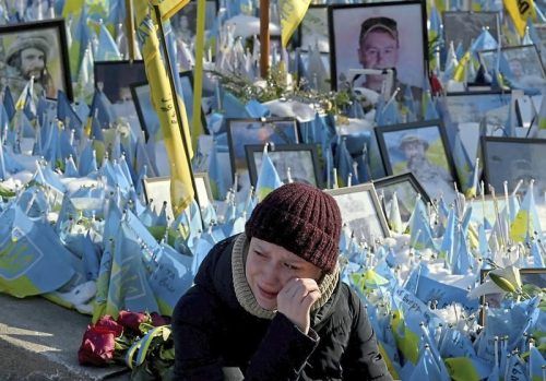 Trauer um zehntausende Tote: Eine Frau weint in Kiew an der Gedenkstätte für die gefallenen Soldaten. Vor drei Jahren begann der Krieg in der Ukraine. © Supinsky/AFP