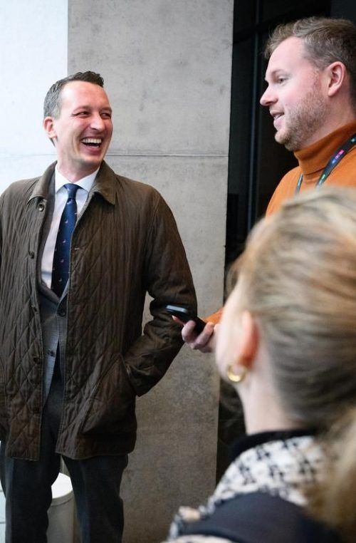Gute Laune: Matthias Helferich (AfD) unterhält sich am Rande der konstituierenden Sitzung der AfD-Fraktion im Deutschen Bundestag mit Journalisten. © dpa