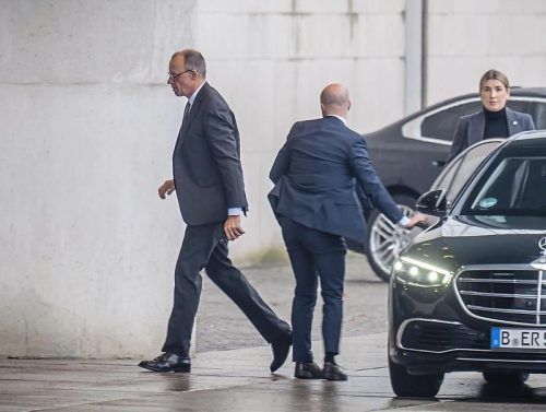 Vorerst ist er hier nur Gast: Friedrich Merz (CDU) kommt mit Personenschützern zum Gespräch mit Olaf Scholz ins Bundeskanzleramt. © Michael Kappeler/dpa