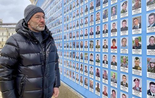„Der Schutzschirm ist nötig“: Manfred Weber bei seinem Ukraine-Besuch vor einem Jahr vor Fotos von Gefallenen. © cd