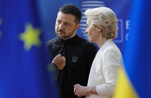 Eng beisammen: Der ukrainische Präsident Wolodymyr Selenskyj und EU-Kommissionschefin Ursula von der Leyen sprechen beim EU-Gipfel. © Omar Havana/dpa