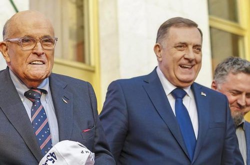 Neue Freunde: Am Abend vor dem Urteil gegen Präsident Dodik (r.) reist Trump-Anwalt Giuliani an. © Pavicic/dpa