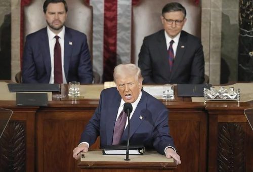 US-Präsident Trump bei seiner Rede vor dem Kongress am 4. März im Kapitol. Hinten links Vize JD Vance. © Curtis/DPA