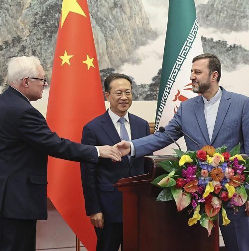 Enge Bande: Sergej Rjabkow, Ma Zhaoxu und Kazem Gharibabadi (v. l.). © Lintao Zhang/dpa
