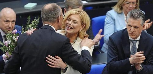 Blumen und Küsschen von Friedrich Merz: Bei der konstituierenden Sitzung des Bundestags ist Julia Klöckner mit 62 Prozent zur neuen Bundestagspräsidentin gewählt worden. © dpa