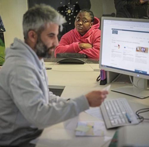 Regionale Unterschiede: Eine junge Frau aus Kamerun sitzt für die Vorregistrierung hinter einer Glaswand im Büro eines Behörden-Mitarbeiters in Eisenhüttenstadt. © Gordon Welters/KNA