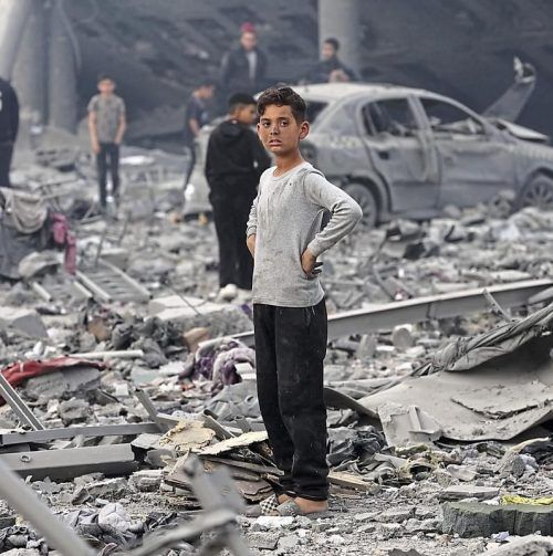 Ein Junge auf einem zerstörten Schulhof in Gaza Stadt. © afp