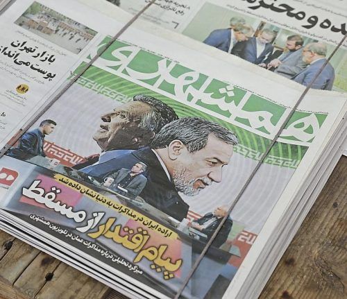 „Machtbotschaft aus Maskat“ titelte eine iranische Zeitung – mit Bildern von Araghtschi (r.) und Witkoff. © epa