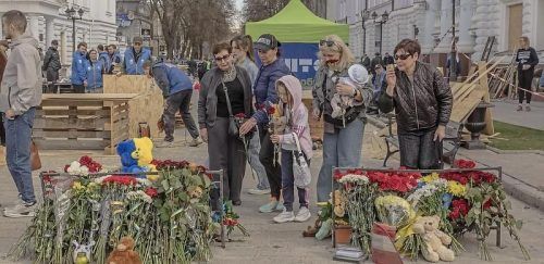 Moskau/Sumy – Das Entsetzen, die Trauer, die Zerstörung sind auch einen Tag später in der ukrainischen Stadt Sumy zu erkennen. Blumen und Kuscheltiere zieren den Boden