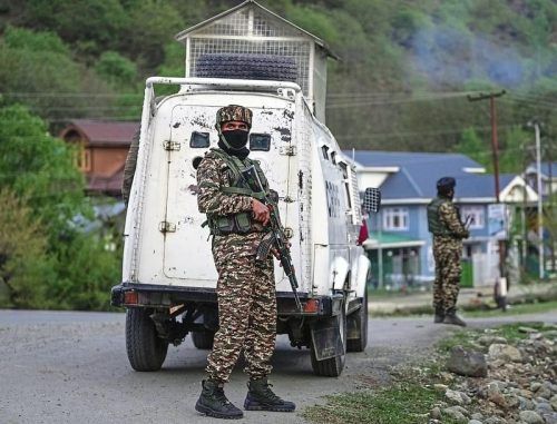 Indische Sicherheitsbeamte stehen nach dem tödlichen Anschlag im indisch kontrollierten Kaschmir Wache. © dpa