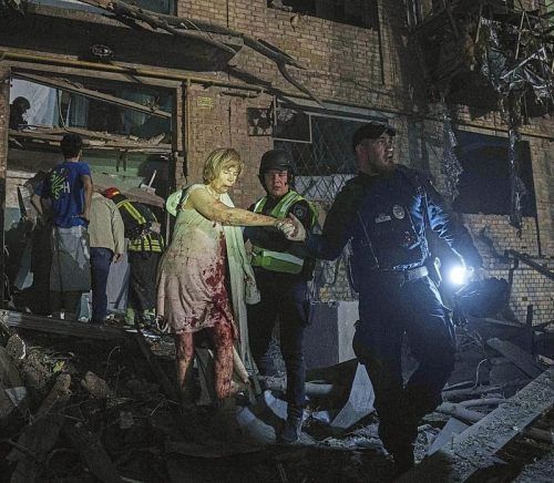 Polizisten führen eine verletzte Frau aus ihrem Haus in Kiew. Bei dem Luftangriff sind neun Menschen gestorben. © dpa