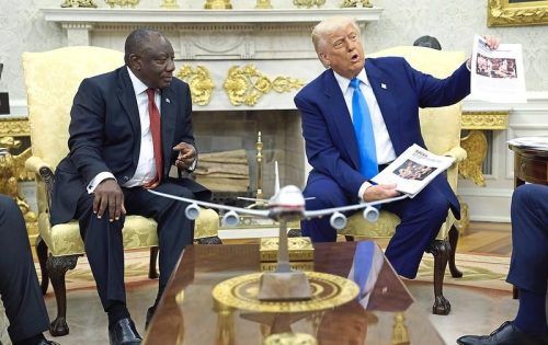 „Tod, Tod, Tod“: US-Präsident Donald Trump zeigt während eines Besuchs von Südafrikas Präsidenten Ramaphosa Berichte von angeblich getöteten weißen Farmern. © Vucci/dpa
