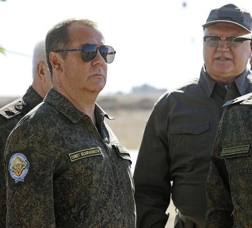 Verbaler Hardliner: Dmitri Medwedew (l.), stellvertretender Vorsitzender des russischen Sicherheitsrates. © dpa