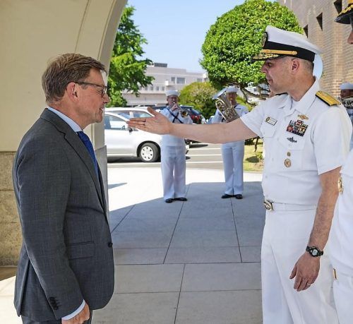 Tokio – Ein kurzes Glockenläuten, Soldaten der US-Marinestreitkräfte salutieren, und während ein Marsch spielt, begrüßt der Konteradmiral der 7. US-Flotte den deutschen Außenminister Johann Wadephul (CDU) auf dem Navy-Stützpunkt Yokosuka in Japan.