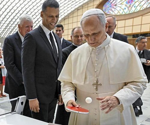 Sportlich: Papst Leo XIV. erhielt ein Tischtennis-Set bei der jüngsten Audienz. © VATICAN MEDIA