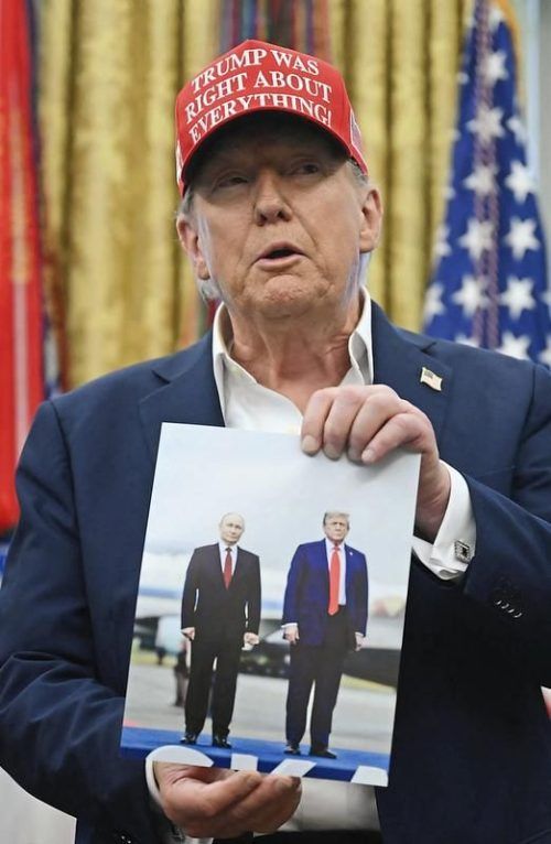 Stolz zeigte US-Präsident Trump noch am 22. August ein Foto von seinem Treffen mit Putin in Alaska. Da hoffte er noch auf baldige Friedensgespräche. © Andrew Caballero-reynolds/AFP