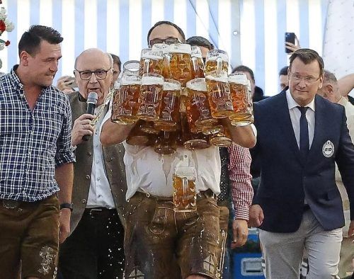 Das Gillamoos jenseits der Politik: Oliver Strümpfel (M) wollte seinen aktuellen Weltrekord mit 29 Krügen verbessern – von den 31 fielen aber zu viele runter. © Daniel Löb/dpa