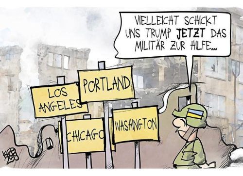 Die Ukraine stellt heimlich Schilder auf © Zeichnung: Koufogiorgos