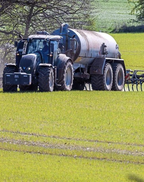 Thema vor Gericht: Ein Traktor zieht einen Tankwagen über ein Feld und verteilt Gülle im Boden. © dpa