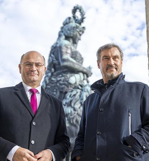 Im Schatten der Bavaria: Finanzminister Albert Füracker mit seinem Chef, Markus Söder. © dpa