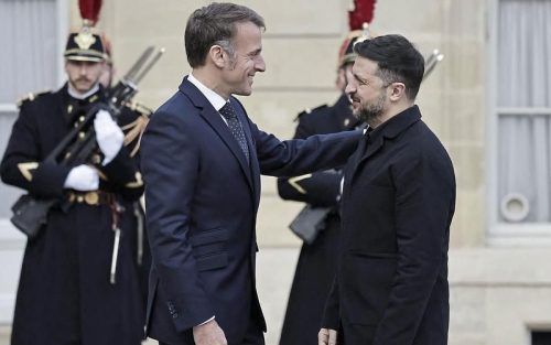 Wichtige Woche: Frankreichs Präsident Emmanuel Macron (l.) begrüßt seinen ukrainischen Amtskollegen Wolodymyr Selenskyj zu Beginn ihres Treffens im Élysée-Palast. © dpa