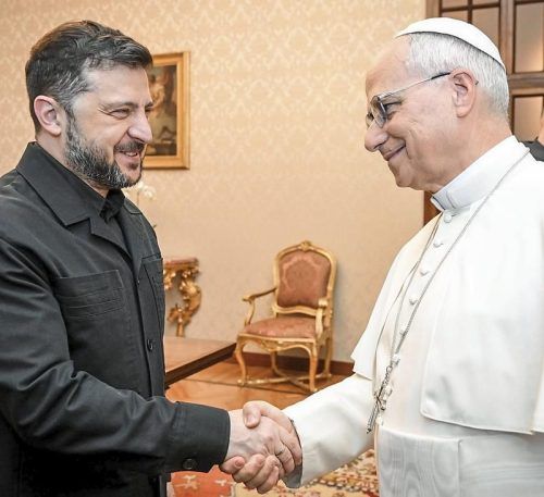 Papst Leo XIV. begrüßt Präsident Selenskyj. © KNA