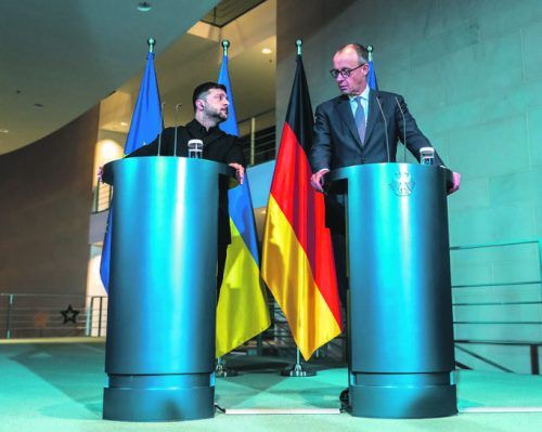Bundeskanzler Friedrich Merz (CDU) nimmt neben Wolodymyr Selenskyj, Präsident der Ukraine (l.) an einer Pressekonferenz im Kanzleramt Teil. In Berlin finden Beratungen zu einem möglichen Frieden in der Ukraine statt. © Lisi Niesner/epd