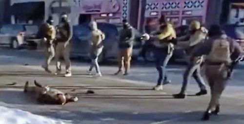 Tödliche Gewalt: Beamte werfen Pretti zu Boden (o. li.). Danach wird ihm scheinbar eine Waffe abgenommen (o. M.). Anschließend zieht ein Vermummter die eigene Pistole und drückt ab (o. re.). Während Pretti regungslos am Boden liegt, schießen die Beamten weiter (u.). © X