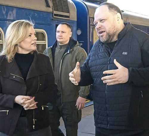 Julia Klöckner (CDU), Bundestagspräsidentin, mit Ruslan Stefantschuk vor dem Sonderzug. © Sina Schuldt/dpa