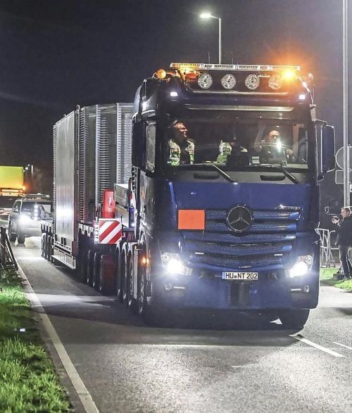 Der Lkw mit dem Castor verlässt Jülich. © Berg/dpa