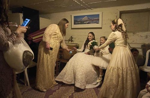 Der schönste Tag? Eine israelische Braut und ihre Familie sitzen in einem Schutzraum, nachdem Raketenalarm ihr Fotoshooting in einem Park unterbrochen hat. © Balilty/dpa